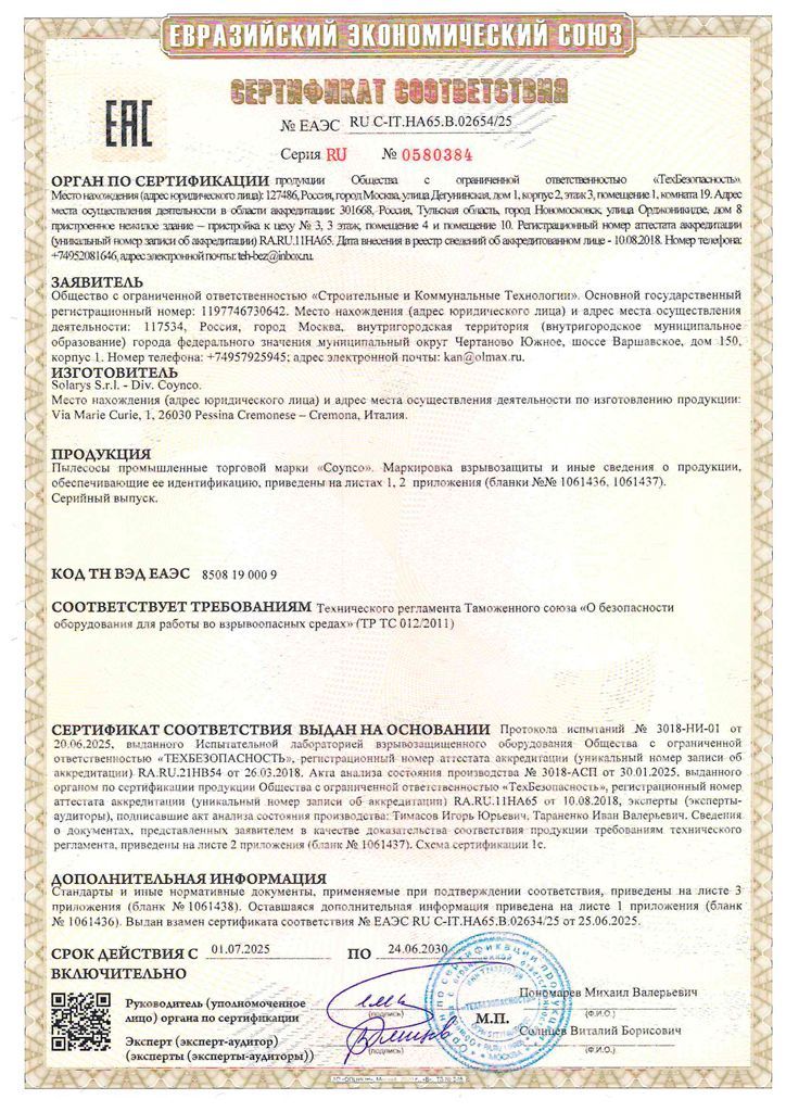 Данный сертификат соответствия рассматривает только требования взрывобезопасности по ТР ТС 012/2011 и не рассматривает любые другие виды безопасности при эксплуатации пылесосов.